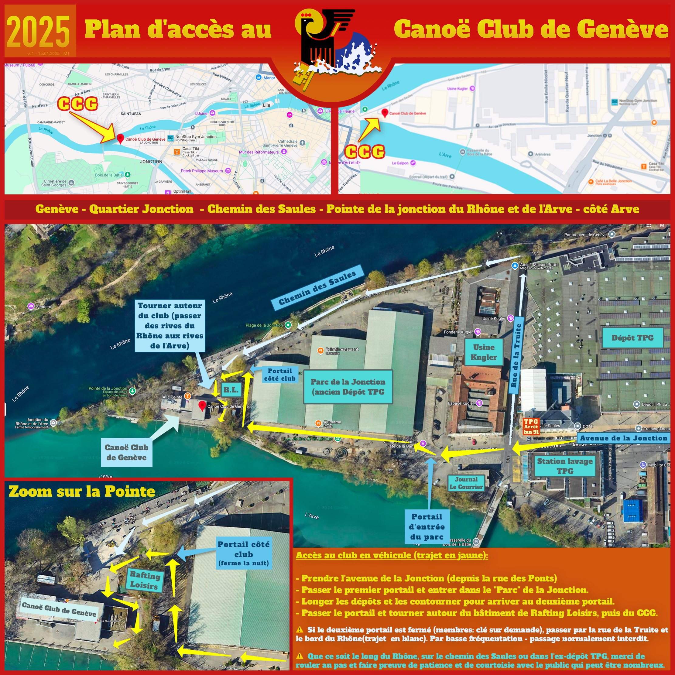 Passer par la rue de la Truite puis le bord du Rhône, ch. des Saules puis faire le tour du club pour se retrouver du côté Arve, devant le bâtiment. En véhicule, merci d’aller au pas, lentement, et être courtois avec les nombreuses personnes à pied.
